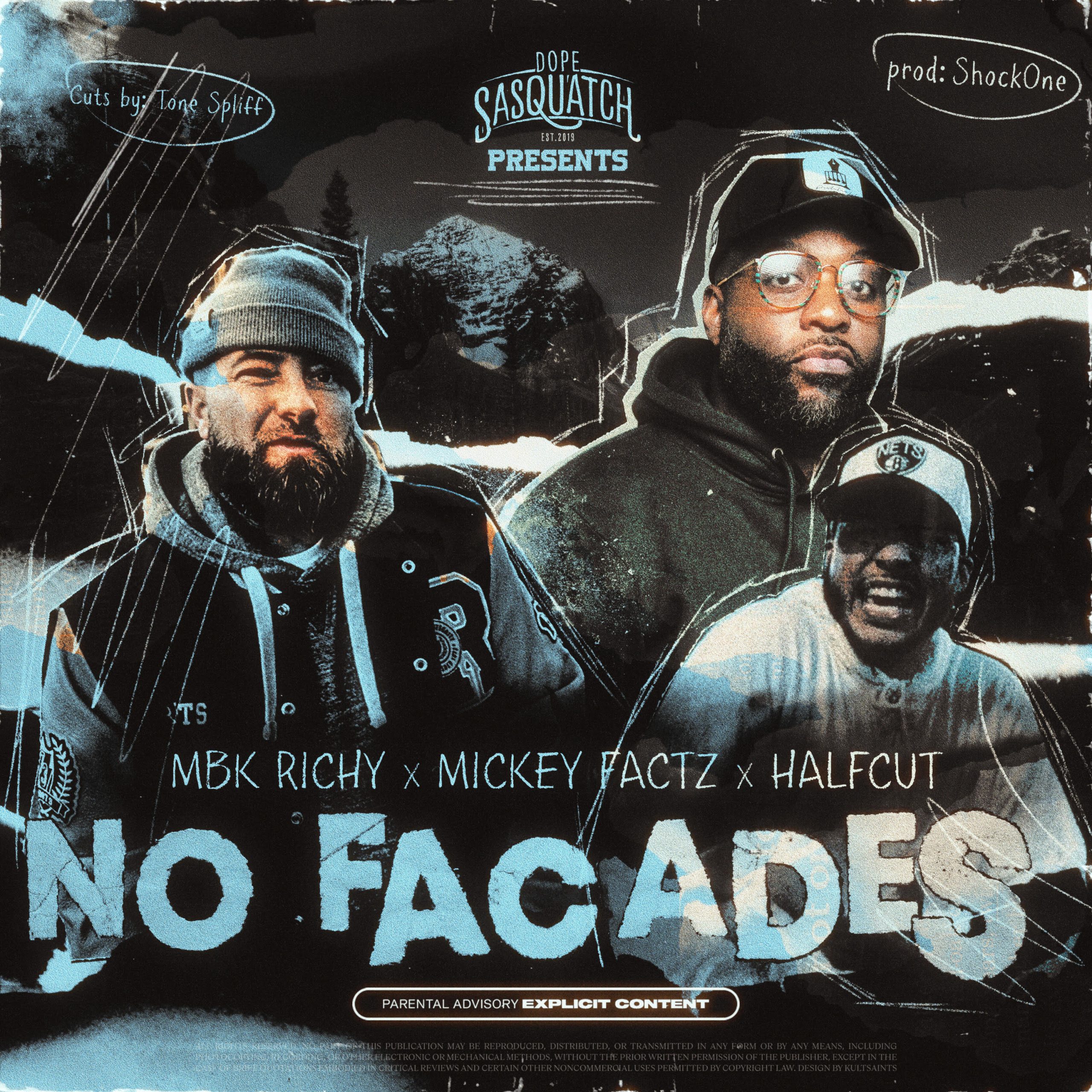 Elmira, NY indie label Dope Sasquatch presents their new single “No Facades” featuring the lyrical stylings of fellow Upstate, NY brethren MBK Richy, Bronx, NY icon Mickey Factz & Calgary (Canada) rap staple Halfcut. The artists take turns expressing how they remain real in a world full of illusions over the soulfully rich production of ShockOne, complete with ginsu sharp cuts by none other than Tone Spliff.